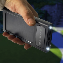 - Cette batterie se recharge de manière autonome par le panneau solaire intégré ou manuellement via le câble USB de chargement intégré à l'appareil