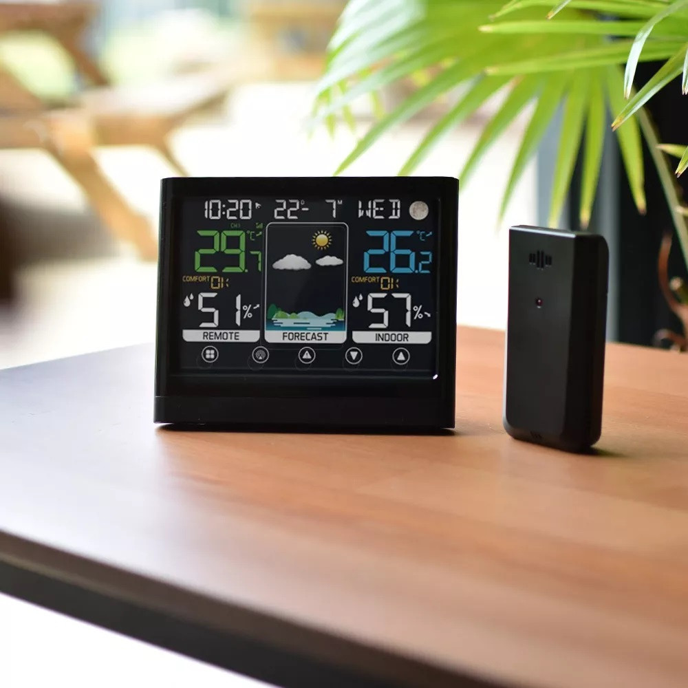 Vous disposerez d'info essentielles telles que la température et l'humidité de l'air en intérieur comme en extérieur (par sonde sans fil fournie), l'heure et la date, le tout résumé au travers d'un écran LCD haute définition et multicolore..