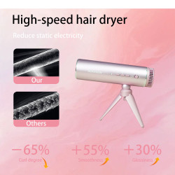 Très puissant au niveau de son souffle, cet élégant objet cylindrique se pose sur son pied amovible aimanté et peut s'orienter à 360° pour un séchage parfait et progressif sans agresser vos cheveux.